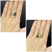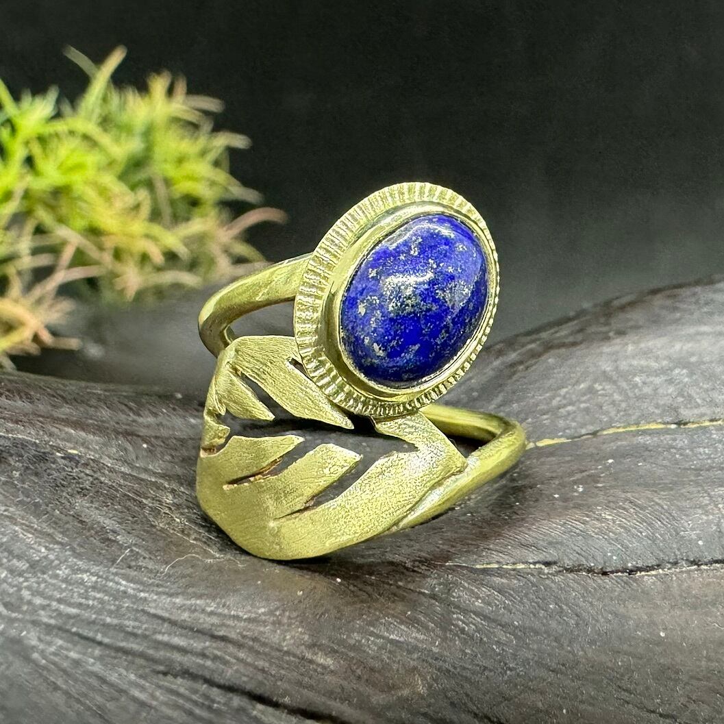 アーム部分には透かし彫りをほどこした大きめの葉っぱを合わせて、ラピスを木の実のようなイメージにしてみました。