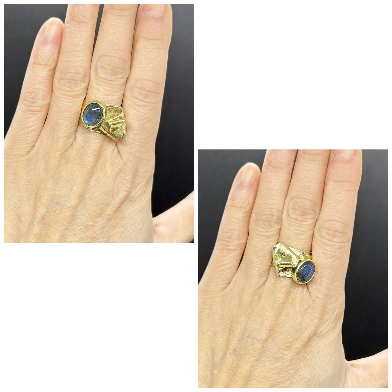どの角度からもブルー系のシラーがしっかり見えるカッコいい石です。