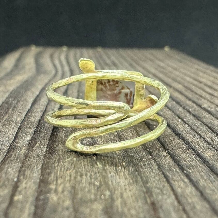 石を真鍮枠で囲み、周りは細かな槌目を入れたクラフト感のあるデザインにしました。