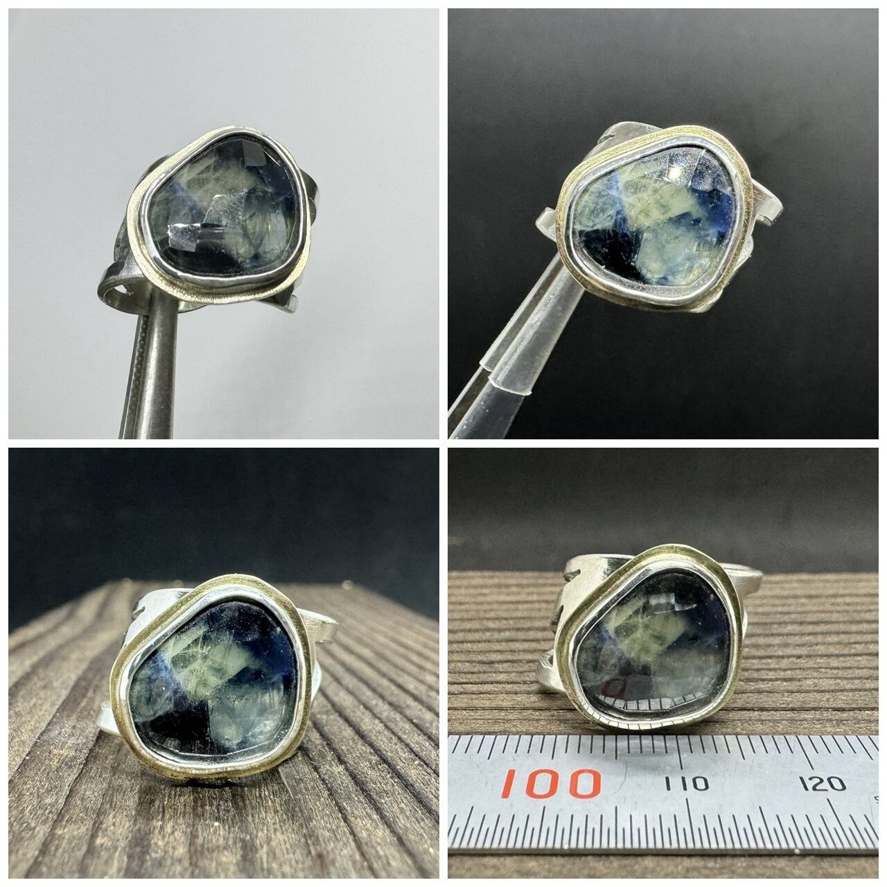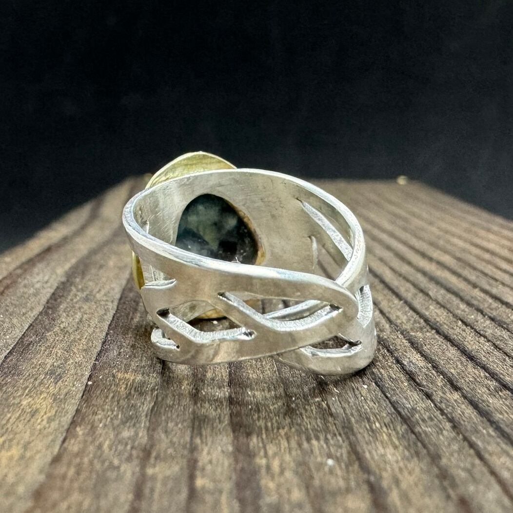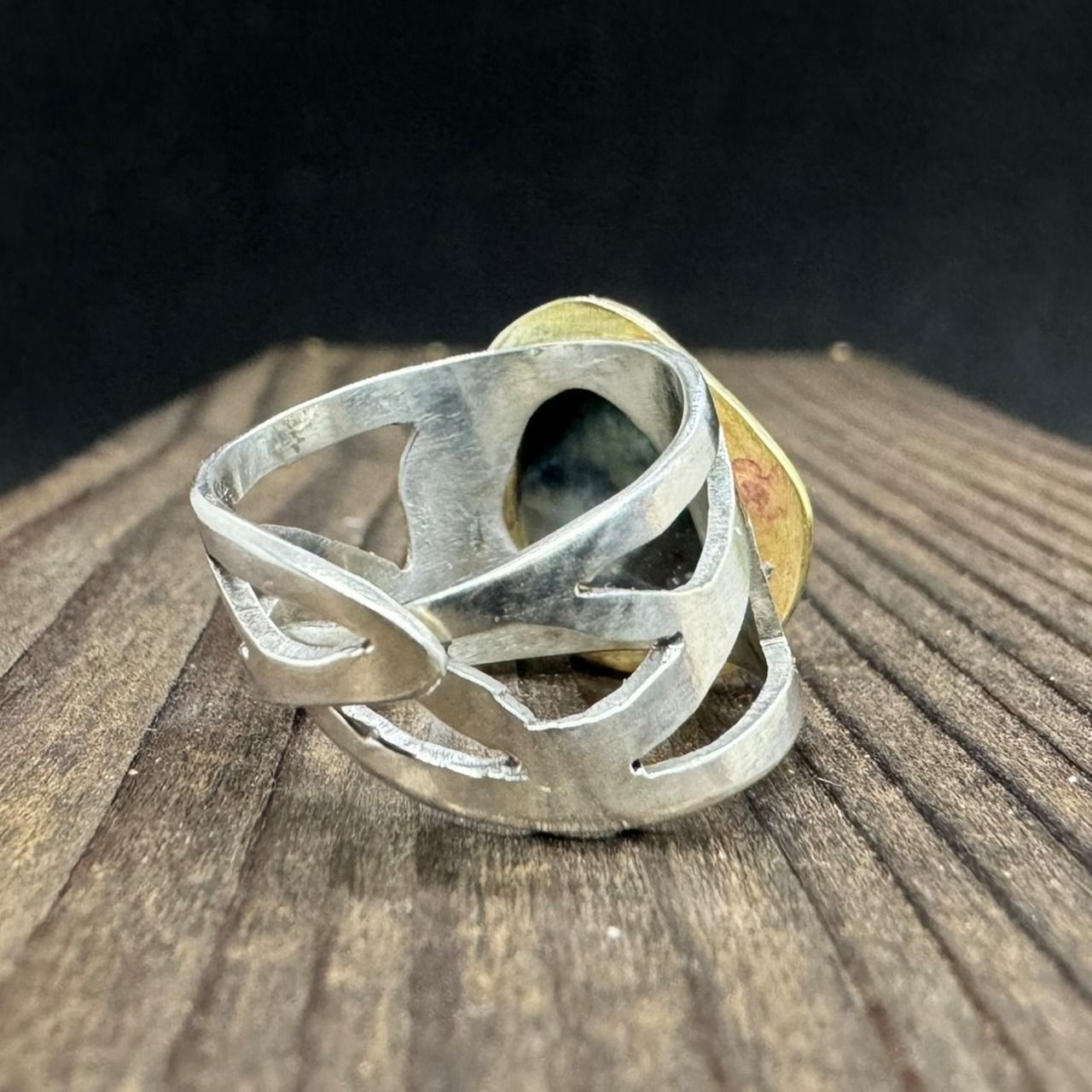 石枠はシルバーで囲み、周りに少しだけ真鍮を残して石を引き立てました。