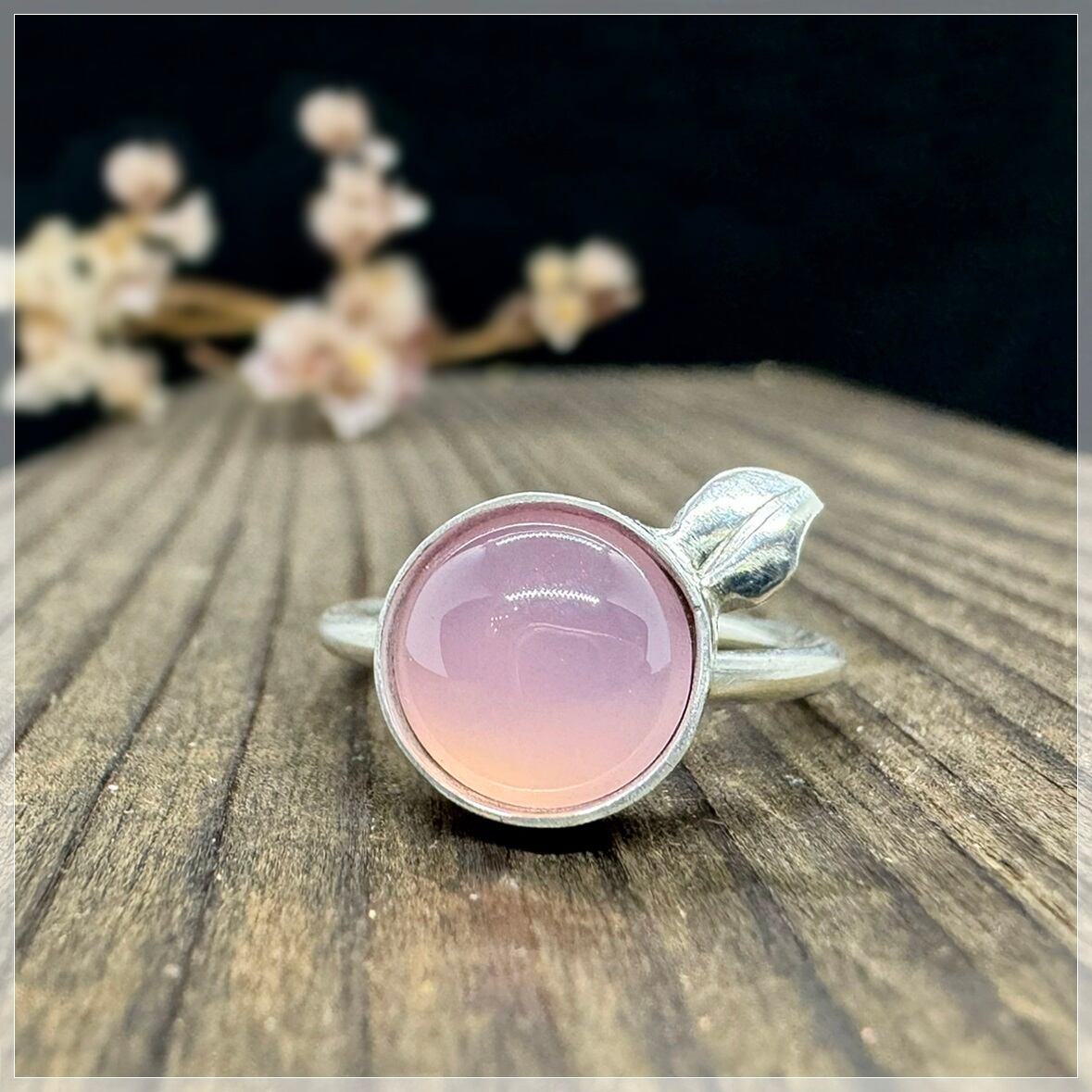 石を桃の実に見立てて、石枠にはシルバーの小さな葉っぱをつけました。