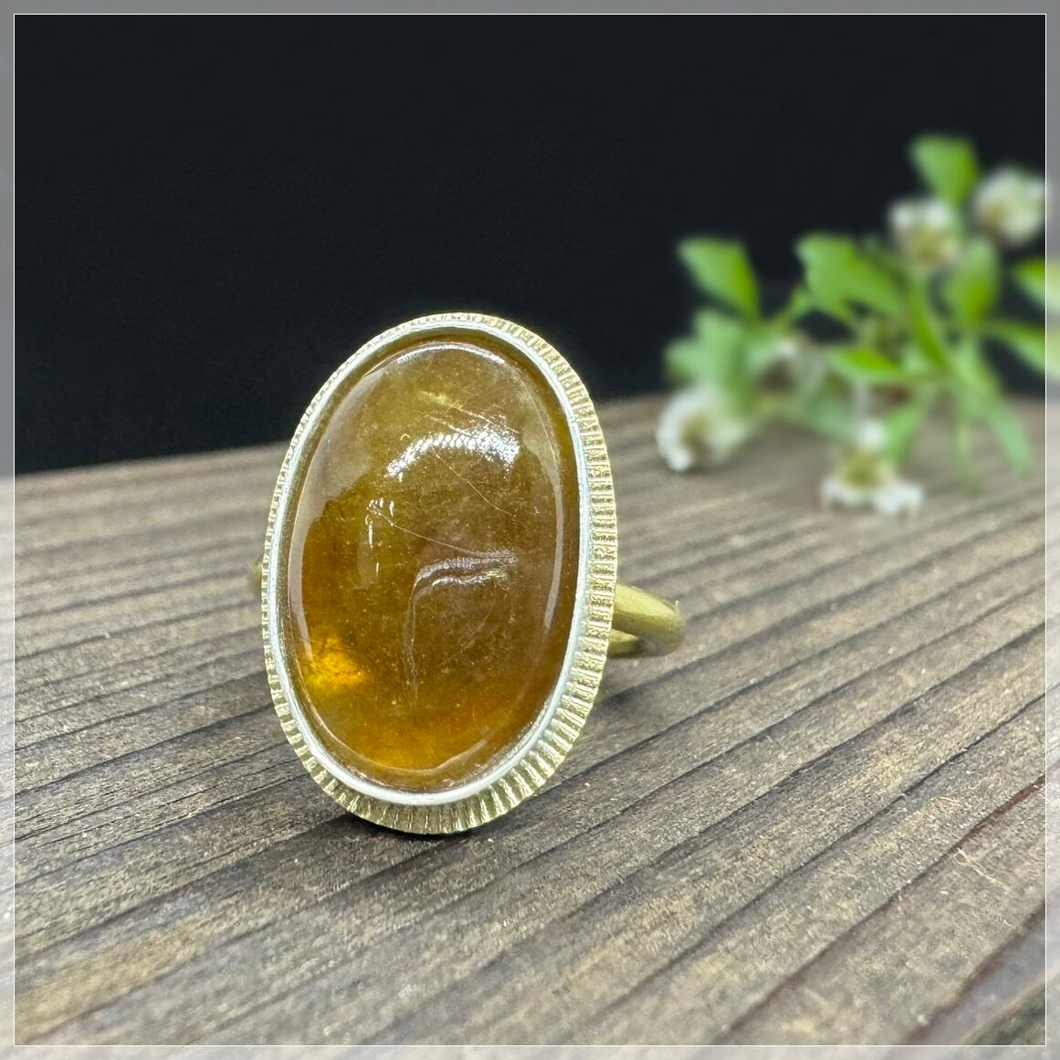 石の周りはシルバーで囲み、その周りの真鍮に細かな飾りを入れて石を引き立てました。