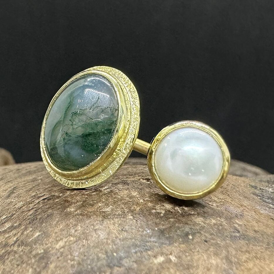 楕円形のモスアゲートと真ん丸の淡水パールを使ったフォークリングです。