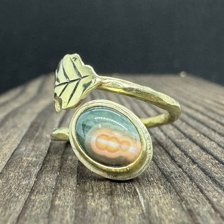 石の模様が可愛いイモムシのように見えたので、葉っぱを食べに来たイモムシをイメージしたリングにしてみました。