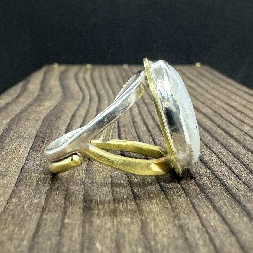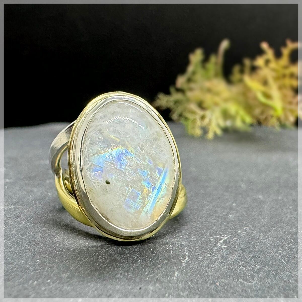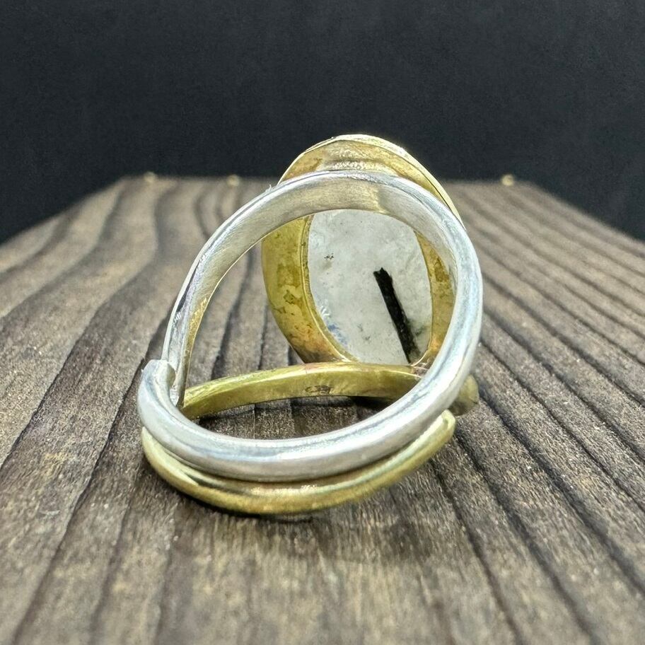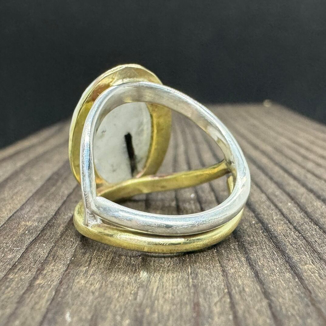 石枠はシルバーにして、周りに真鍮を少し残して石を引き立てました。