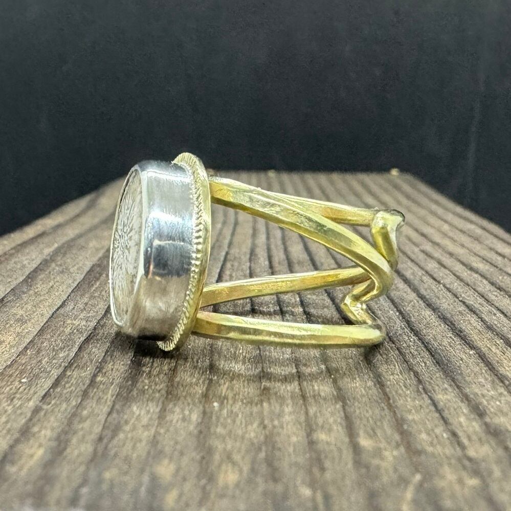 石はシルバーで囲み、更にその周りの真鍮に細かな飾りを入れて石を引き立てました。