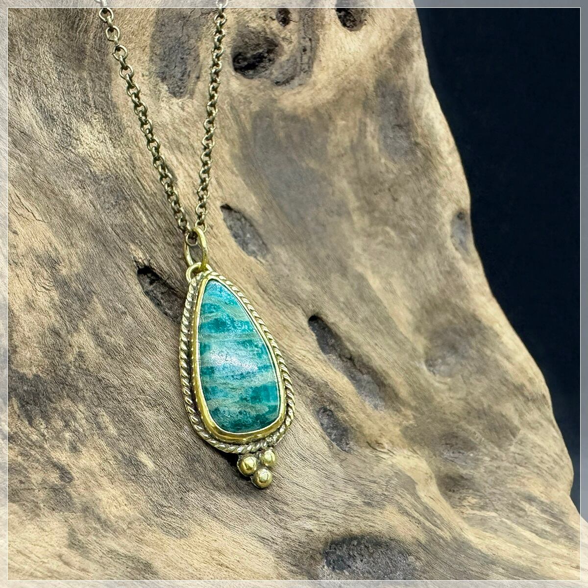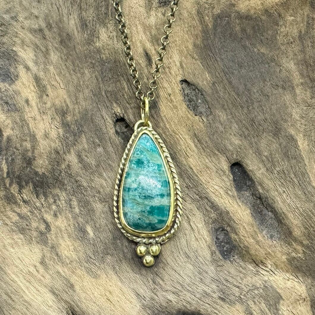 長い雫型が特徴的なアマゾナイトのネックレスです。