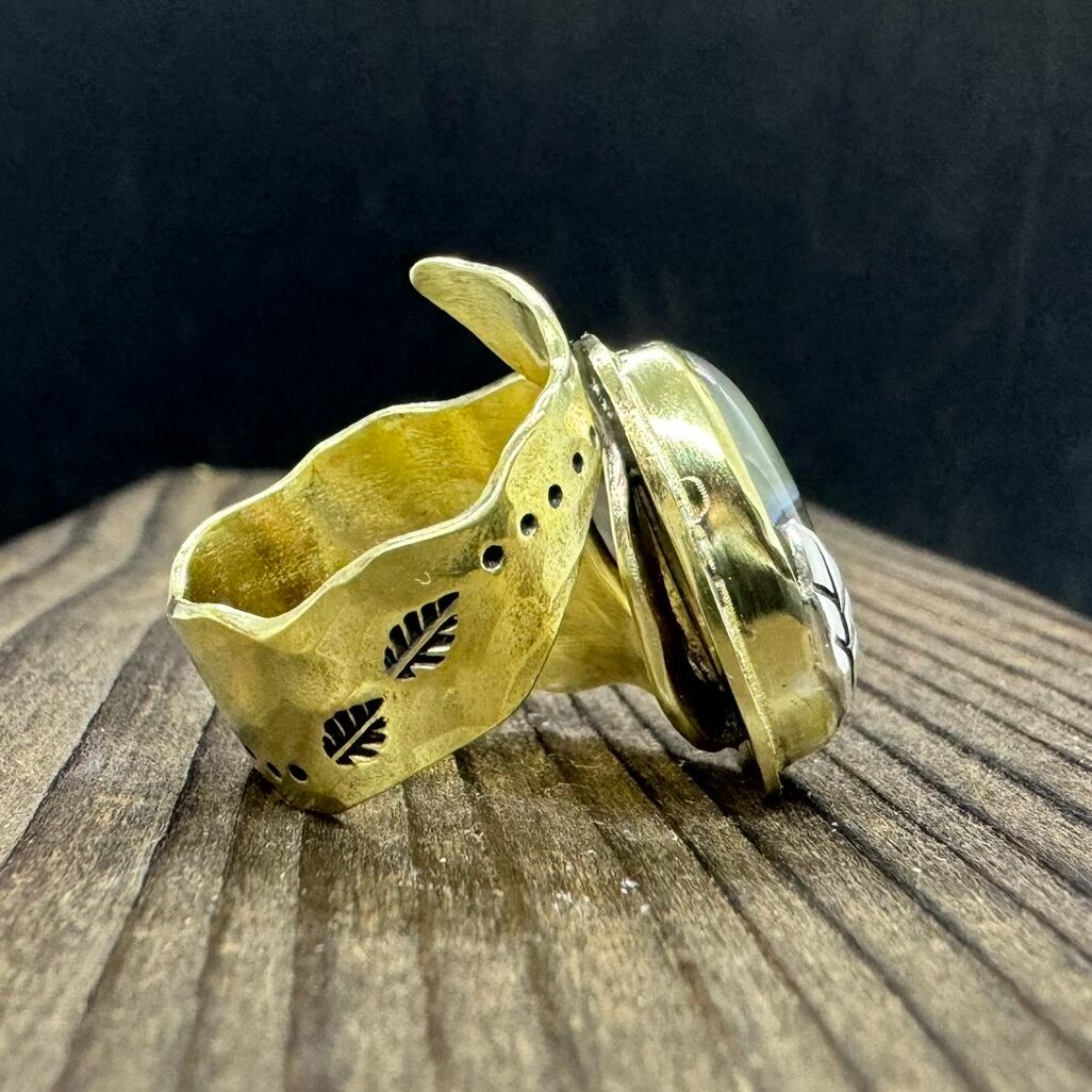 石は真鍮で囲み、揺れる模様に合わせて小さなシルバーの葉っぱをプラスしました。