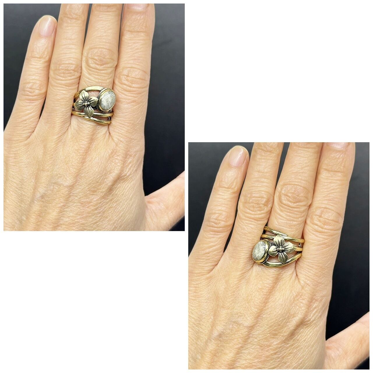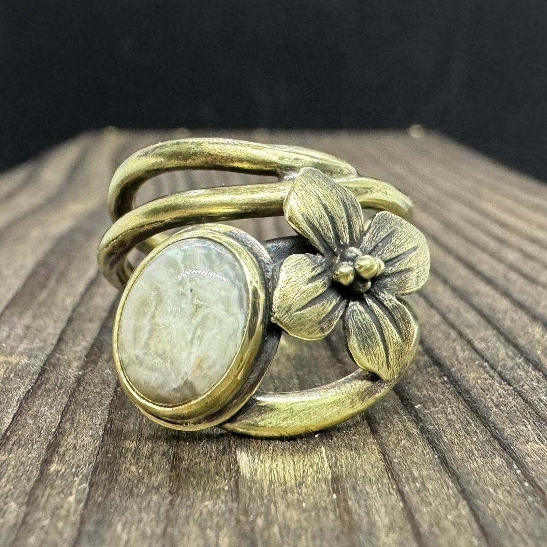 石の雰囲気に合わせてアンティークなデザインにしたかったので、4花弁の花を合わせて、真鍮も少し燻してみました。