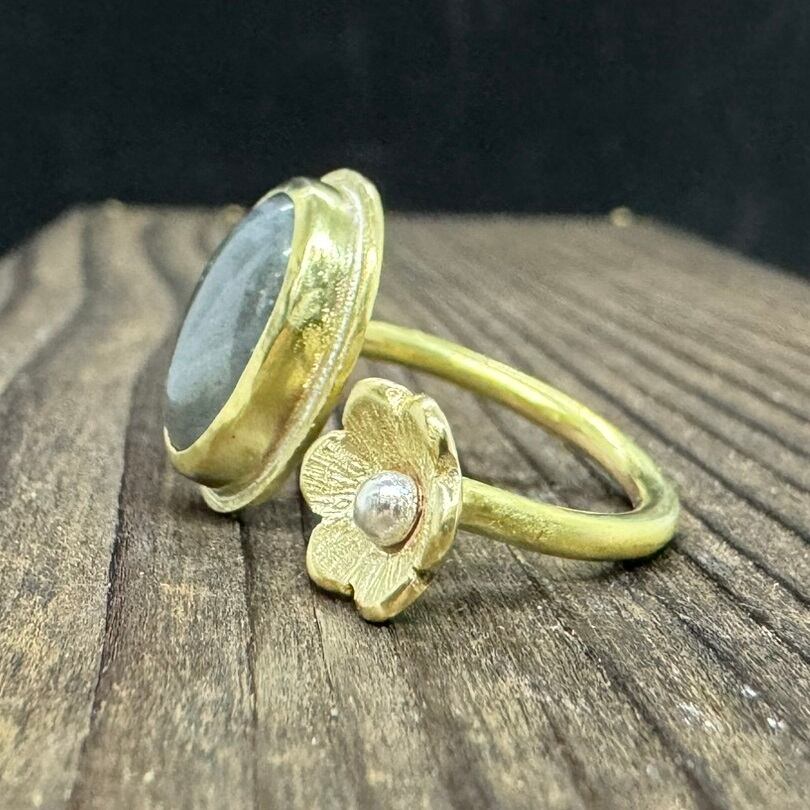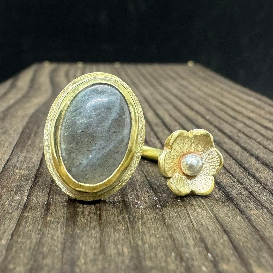 ラブラドライトと真鍮の色味、花のデザインが合わさって存在感のある大人可愛いフォークリングになりました。