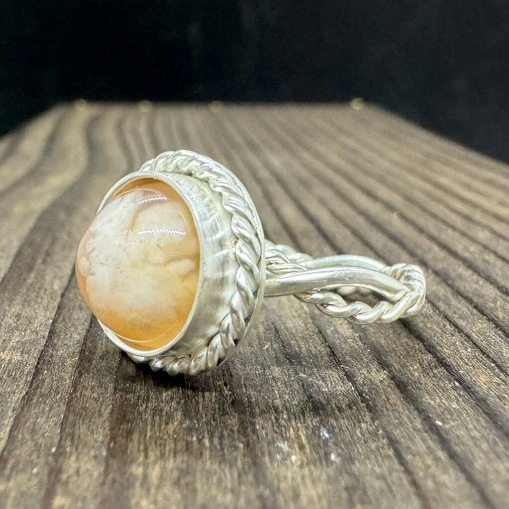 石枠はシルバーで、その周りは細いシルバーのツイスト線を合わせて石を引き立てました。