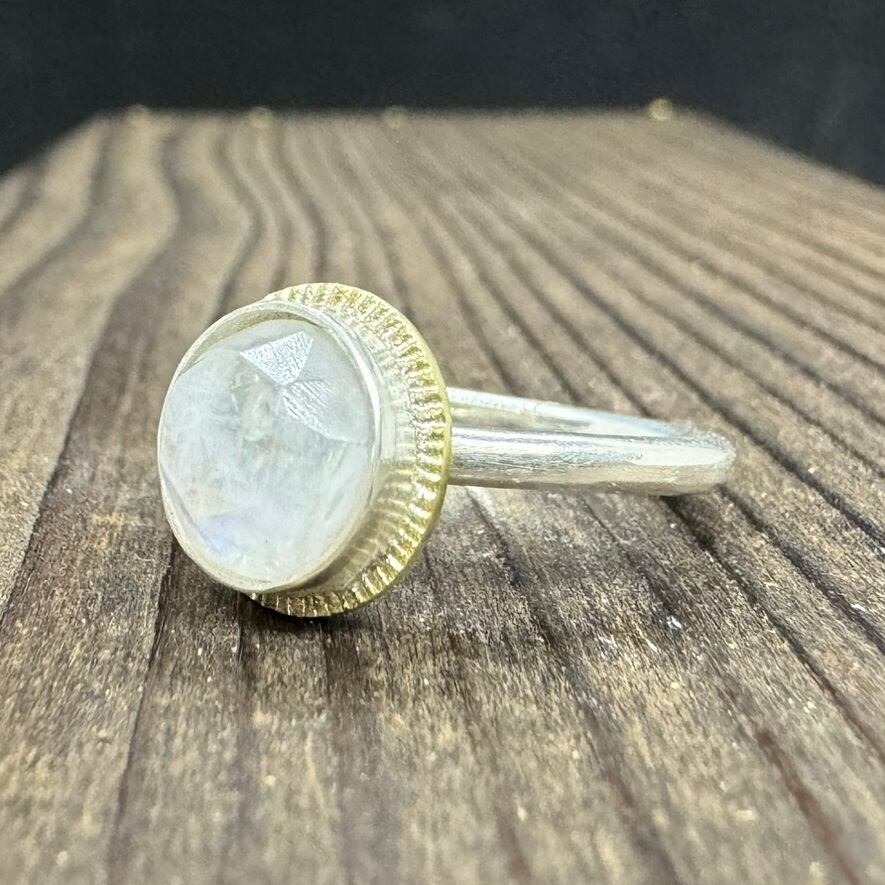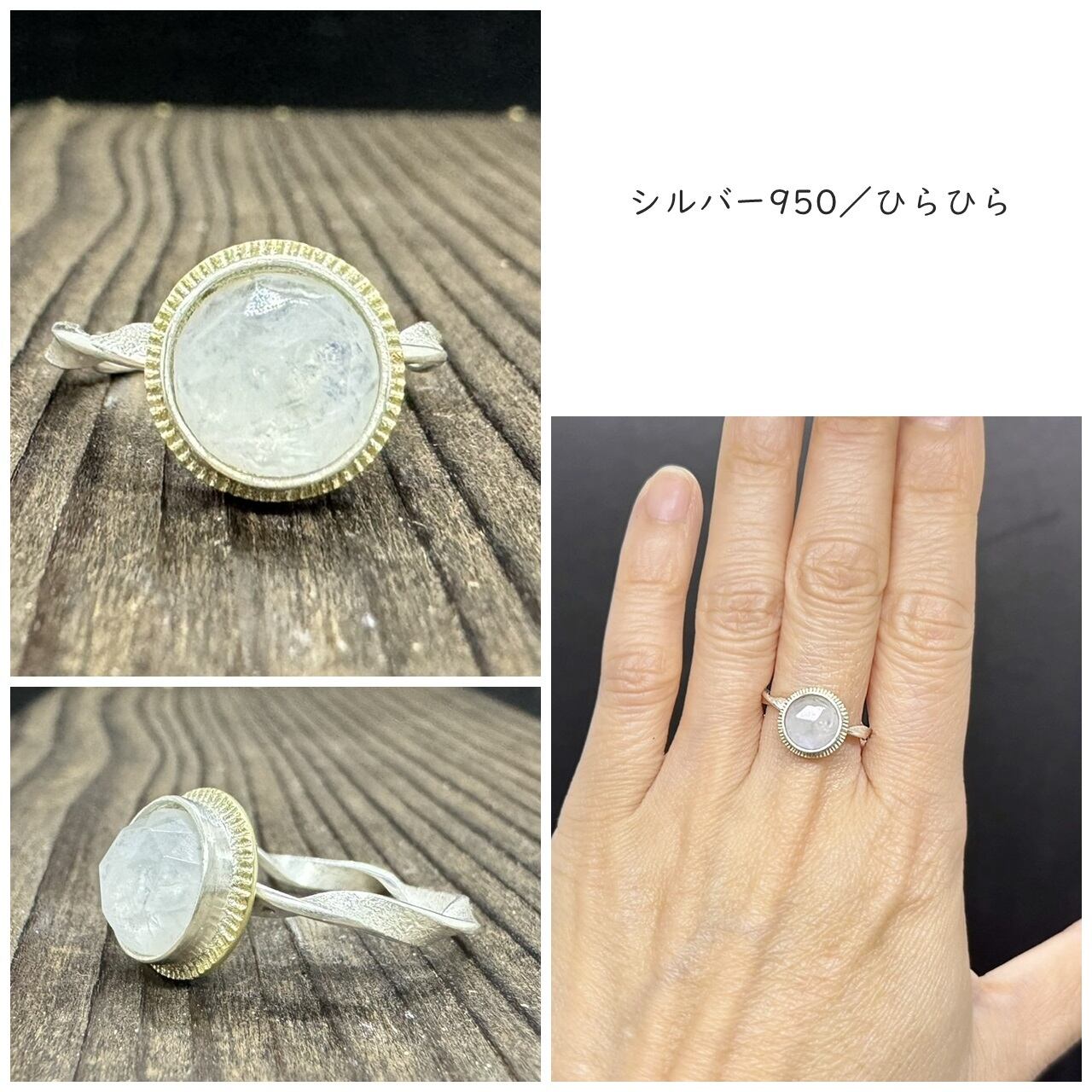 石枠はシルバーにして、周りの真鍮に細かな飾りを入れて石を引き立てました。