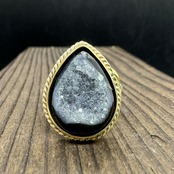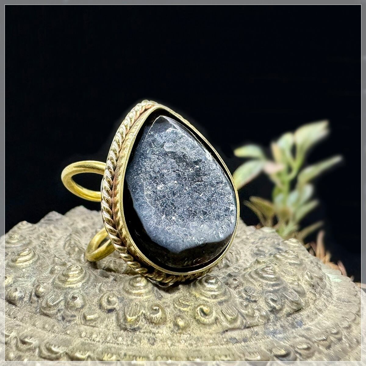 石は真鍮で囲み、その周りに真鍮の細いツイスト線を合わせて石を飾りました。