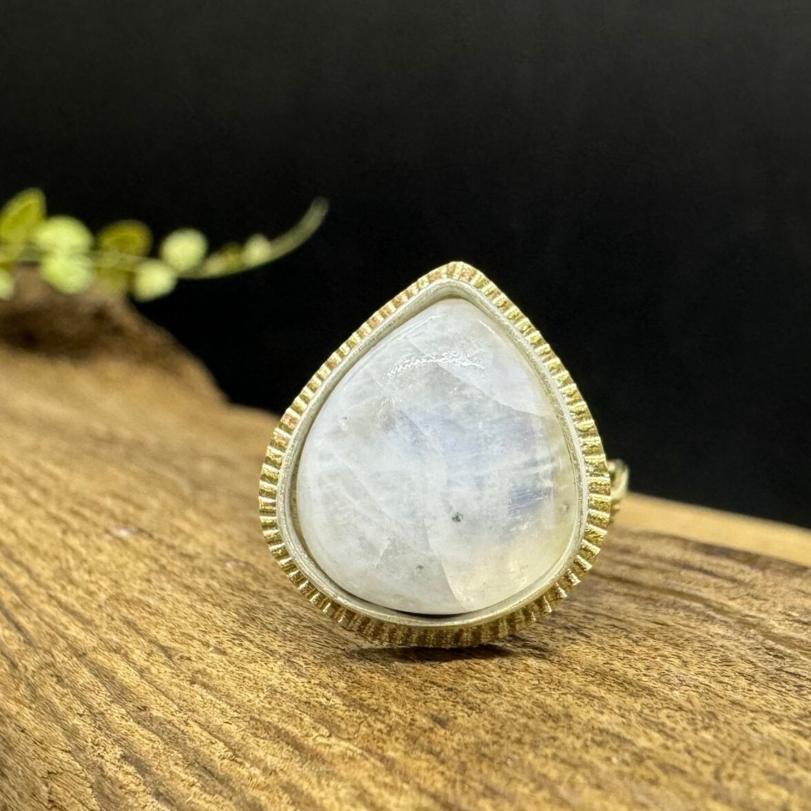 石枠はシルバーにして、周りの真鍮に細かな飾りを入れて石を引き立てました。