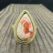 石の周りは真鍮で囲み、その周りを細い真鍮のツイスト線で囲み石を引き立てました。