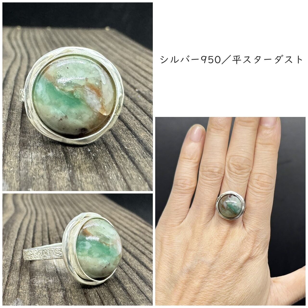 石はシルバーで囲み、その周りにゆるく波打ったシルバーを合わせて立体感を出しフワフワした雰囲気にしました。
