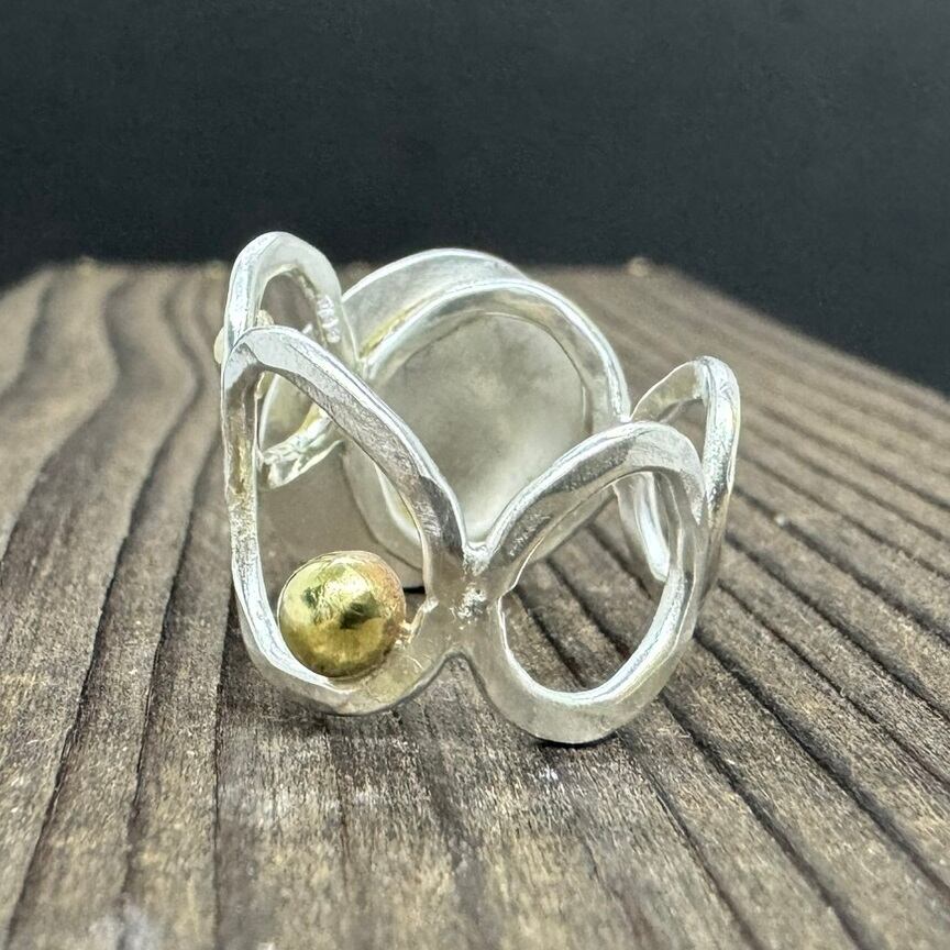 石の見た目に合わせて丸の中に真鍮の粒を合わせてアクセントにしています。