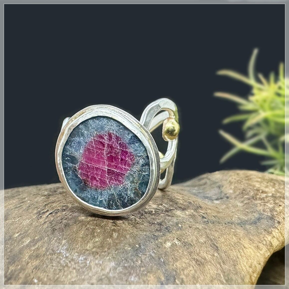 ラフな印象のルビーインゾイサイトに合わせて、石の周りも軽く槌目を入れてクラフト感を出しました。