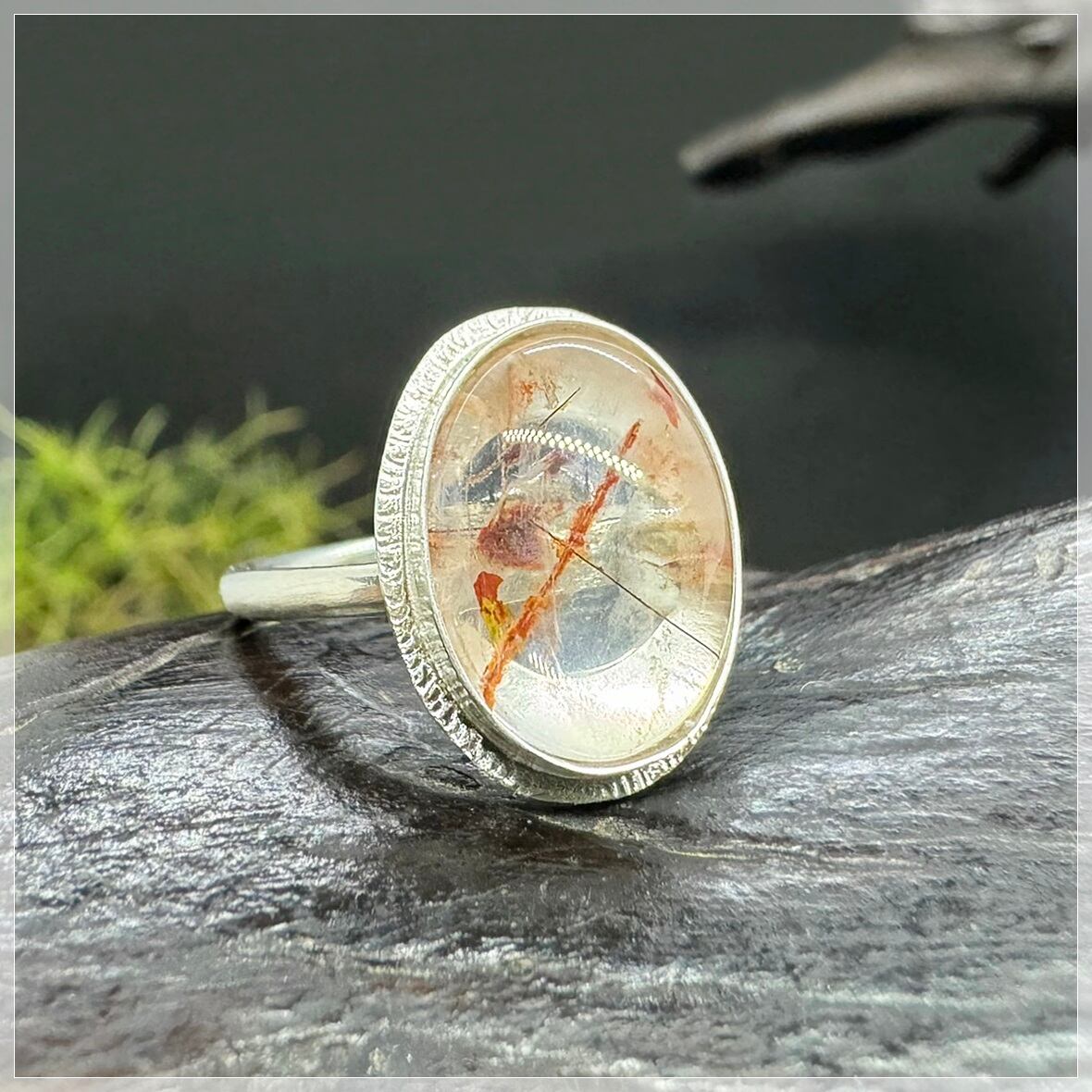 クォーツの中に赤やオレンジの内包物が入っていて、ルチルも含まれている個性的な石です。
