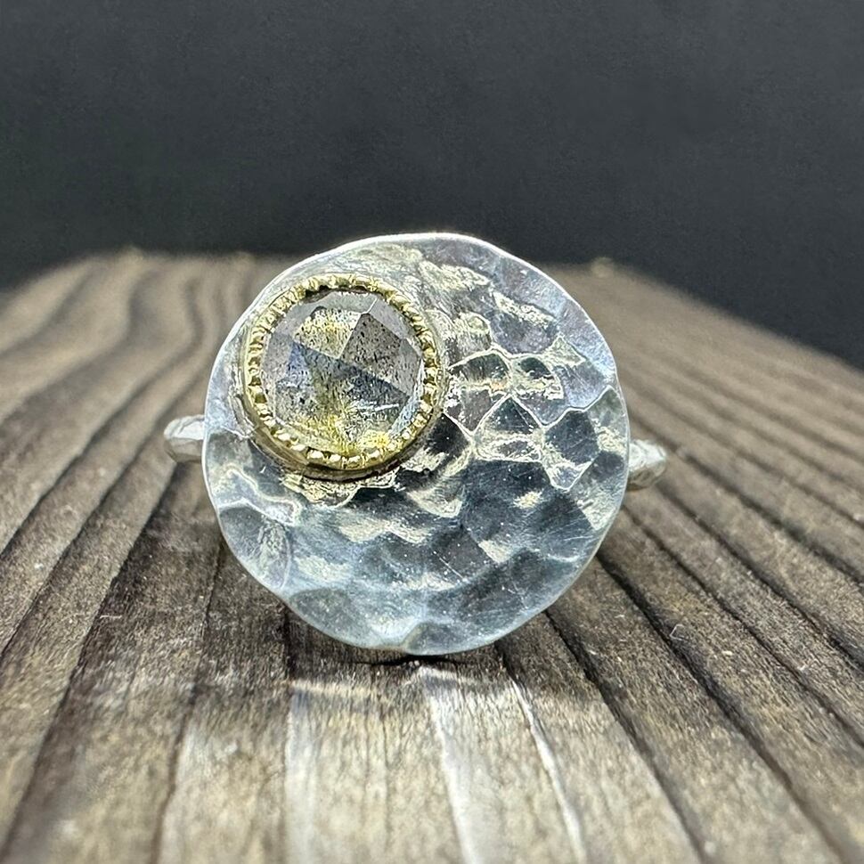 トップ部分には大きめの丸いシルバープレートにポコポコとした槌目を入れ、クラフト感を出しました。
