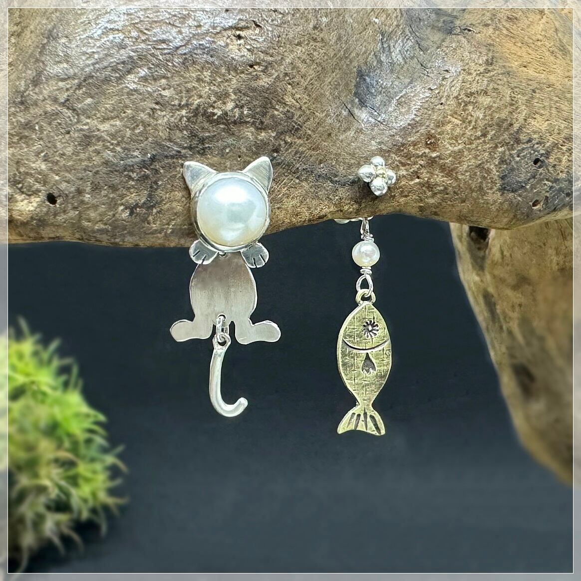 淡水パールを猫の顔に見立てて、耳と前足をつけました。