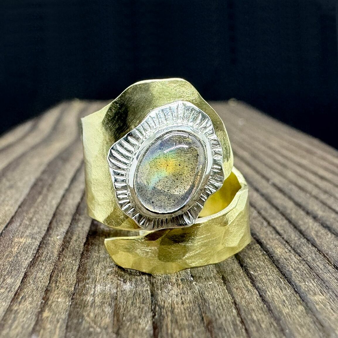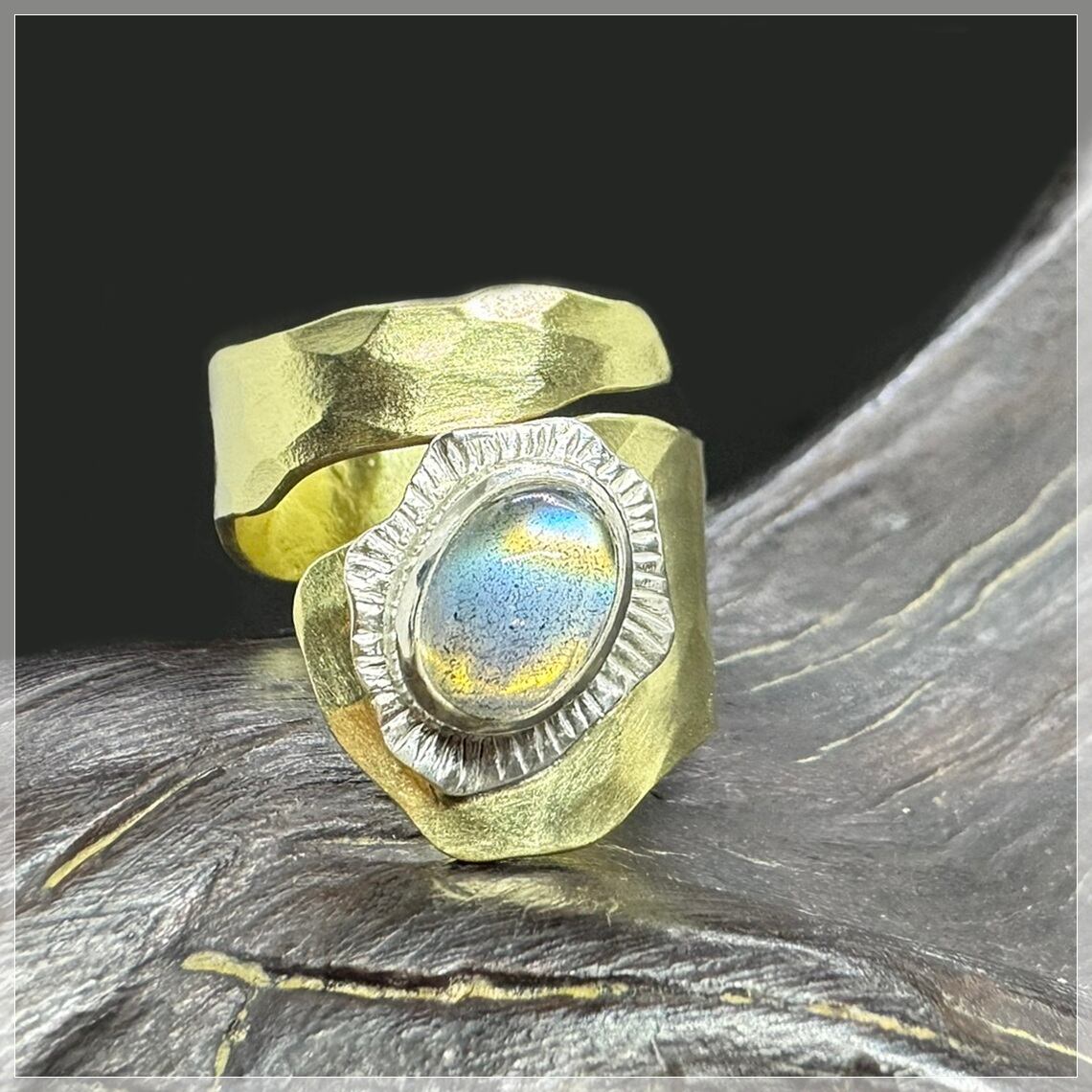 シルバーと真鍮の形や角度にこだわった個性的な指輪になりました。