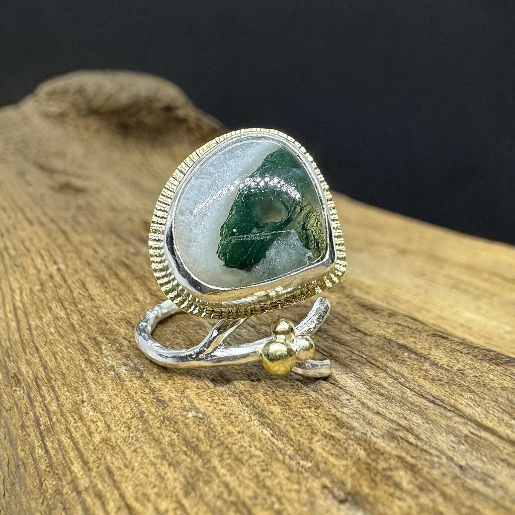 ぷっくり雫型のモスアゲートのリングです。