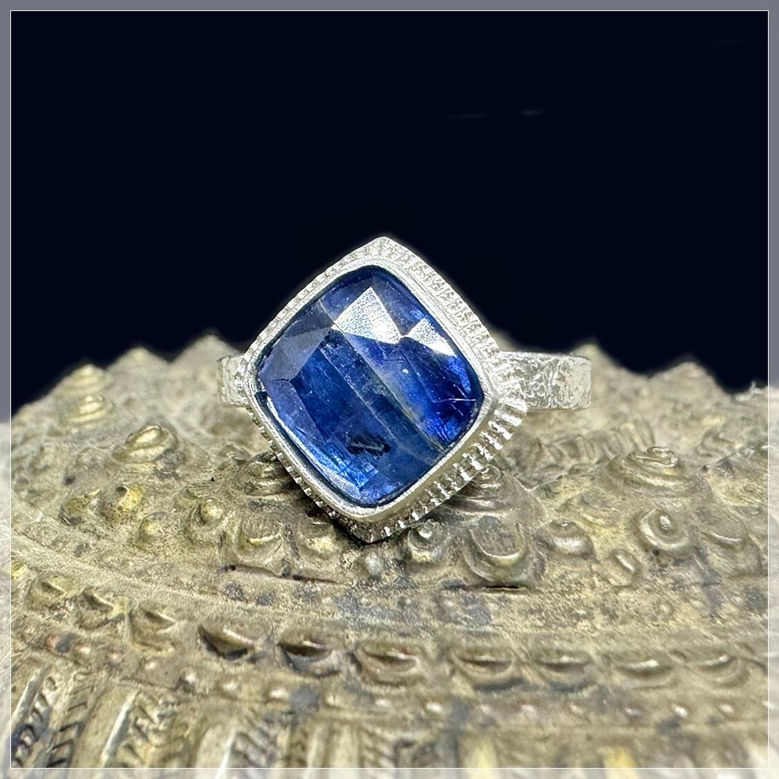 小振りで普段使いしやすいサイズ感で、ブルーがキリッと引き締まった印象を与える大人カッコいい指輪になりそうです。