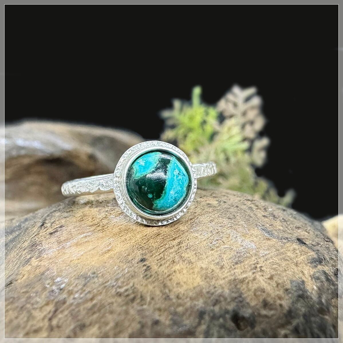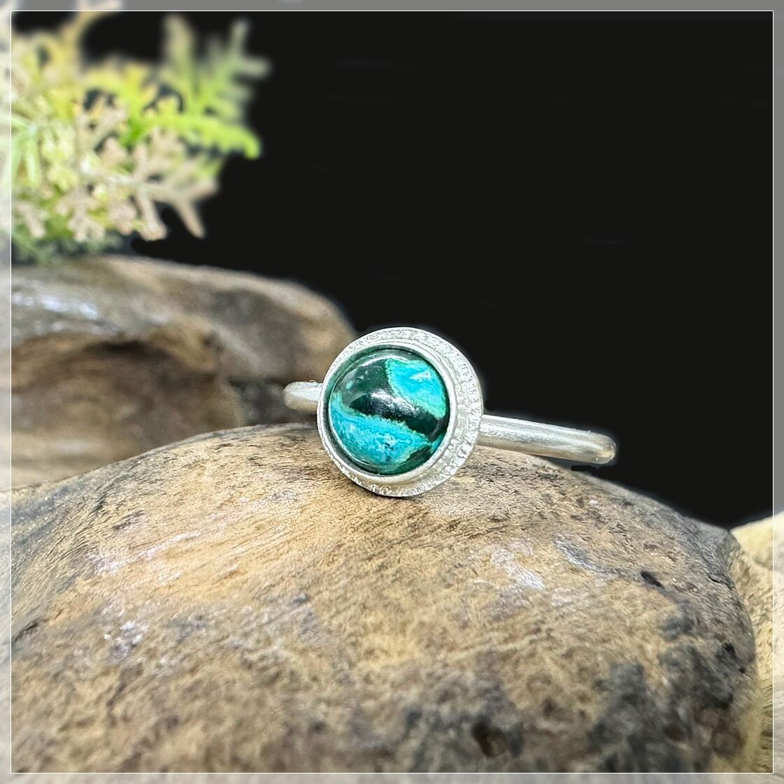 石はシルバーで囲み、周りのシルバーに細かな飾りを入れて石を引き立てました。