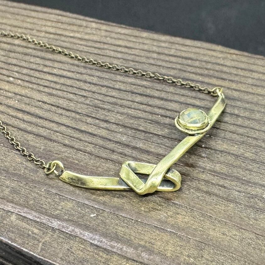 線を意識したネックレスを作りたかったので、平たくした真鍮線を折り曲げてバーネックレスのような雰囲気にしました。