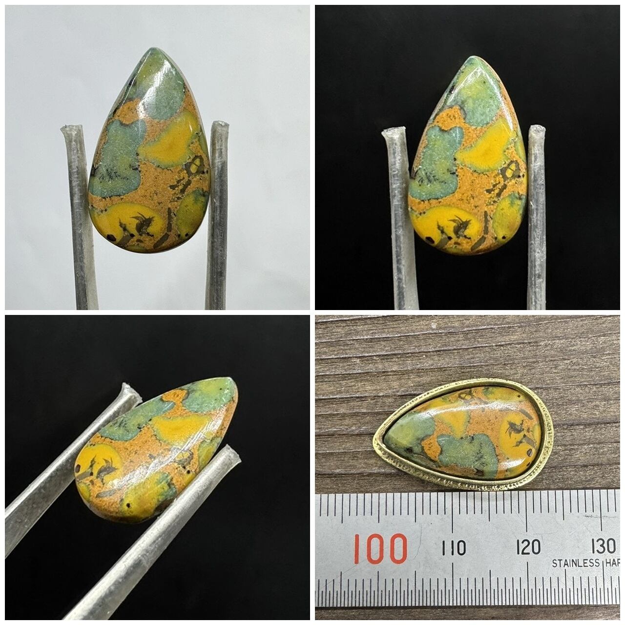 マットな質感で淡いグリーンや黄色、薄茶色が混ざり合ったレトロな雰囲気で、その名の通り南国のフルーツを連想させる石です。
