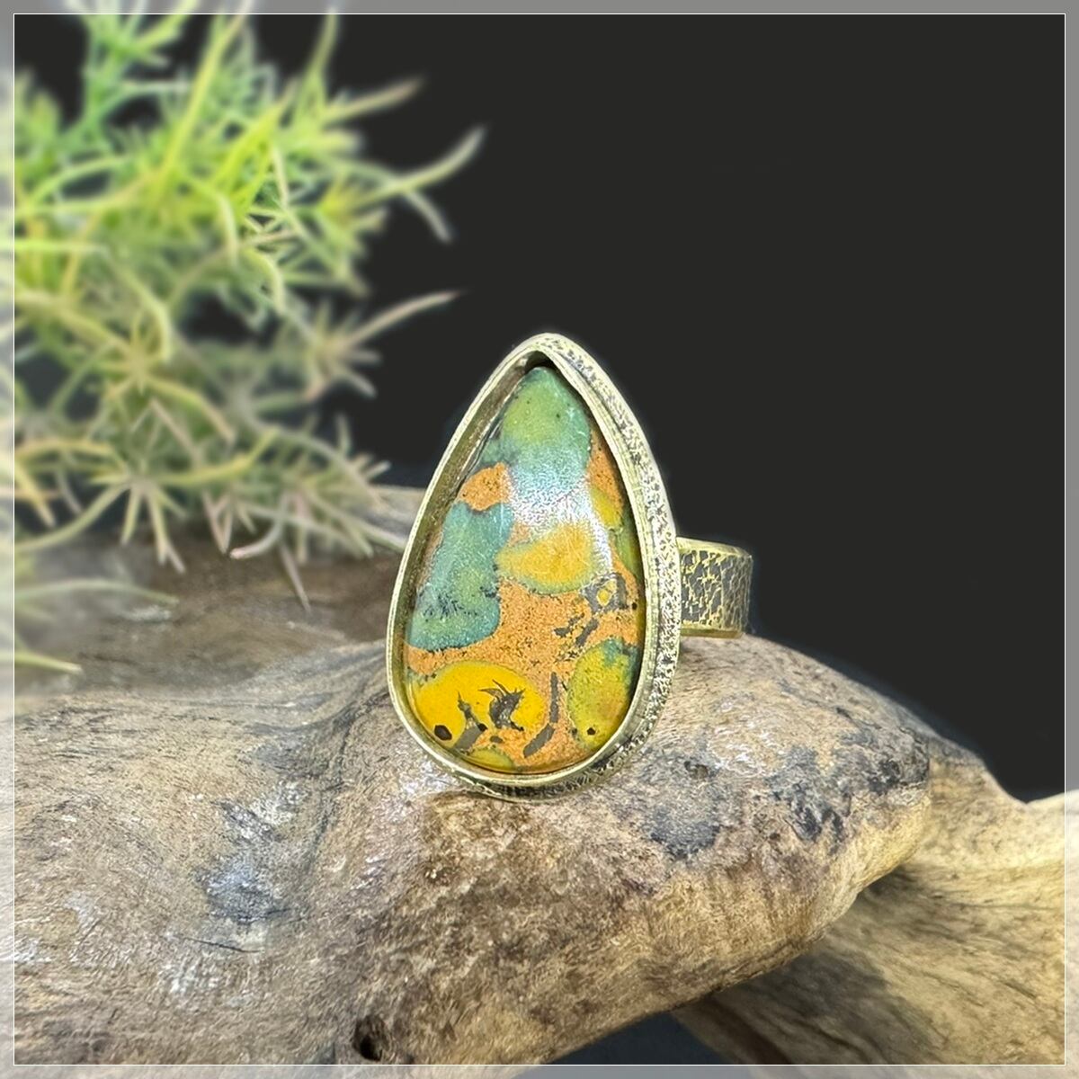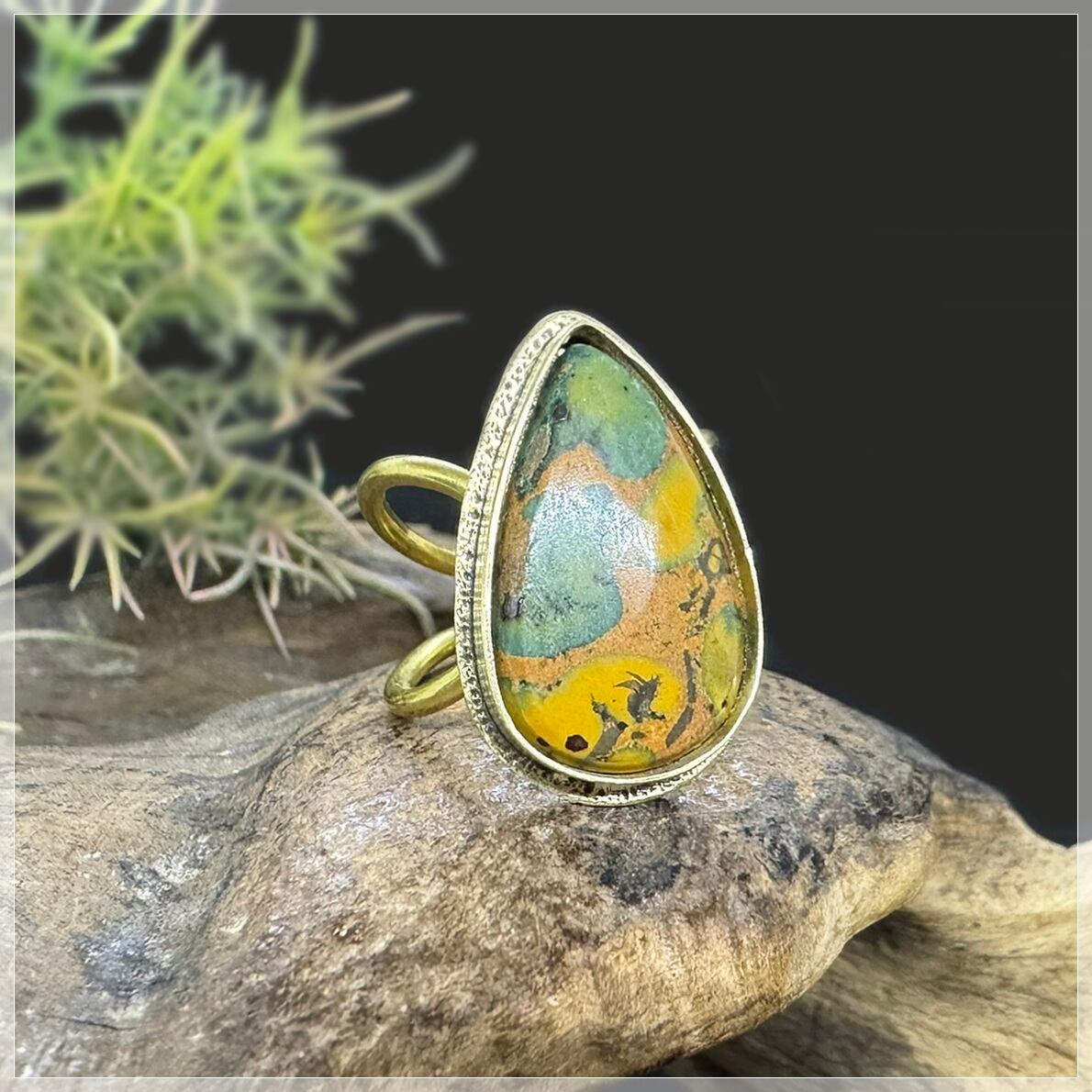 石は真鍮で囲み、周りの真鍮を細かく荒らして石を飾りました。