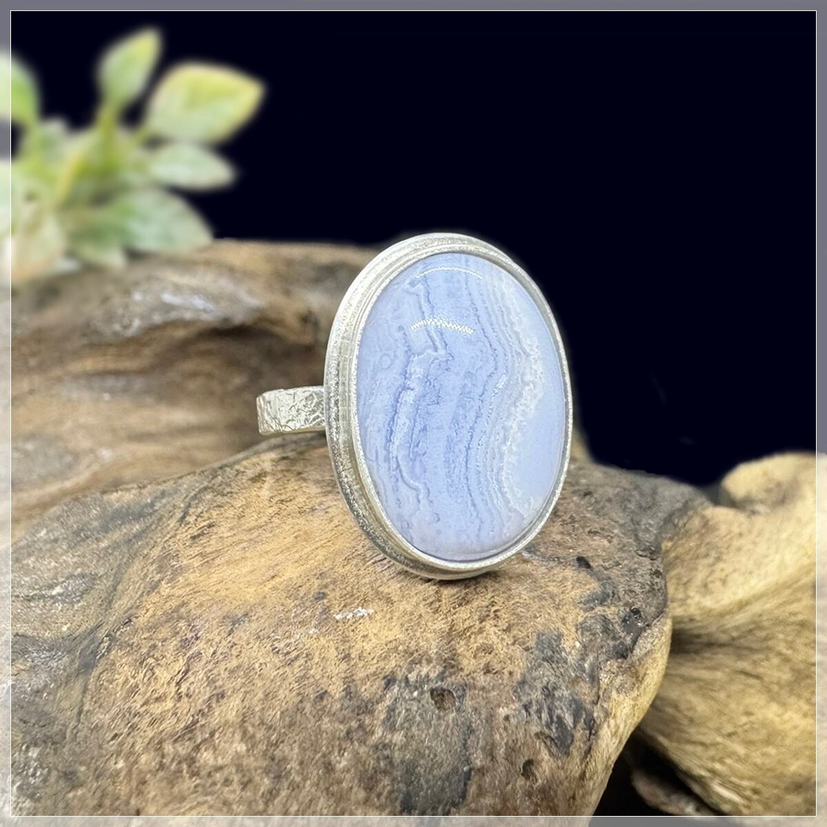 淡いミルキーブルーと波のようなレース模様が繊細で爽やかな印象の石です。