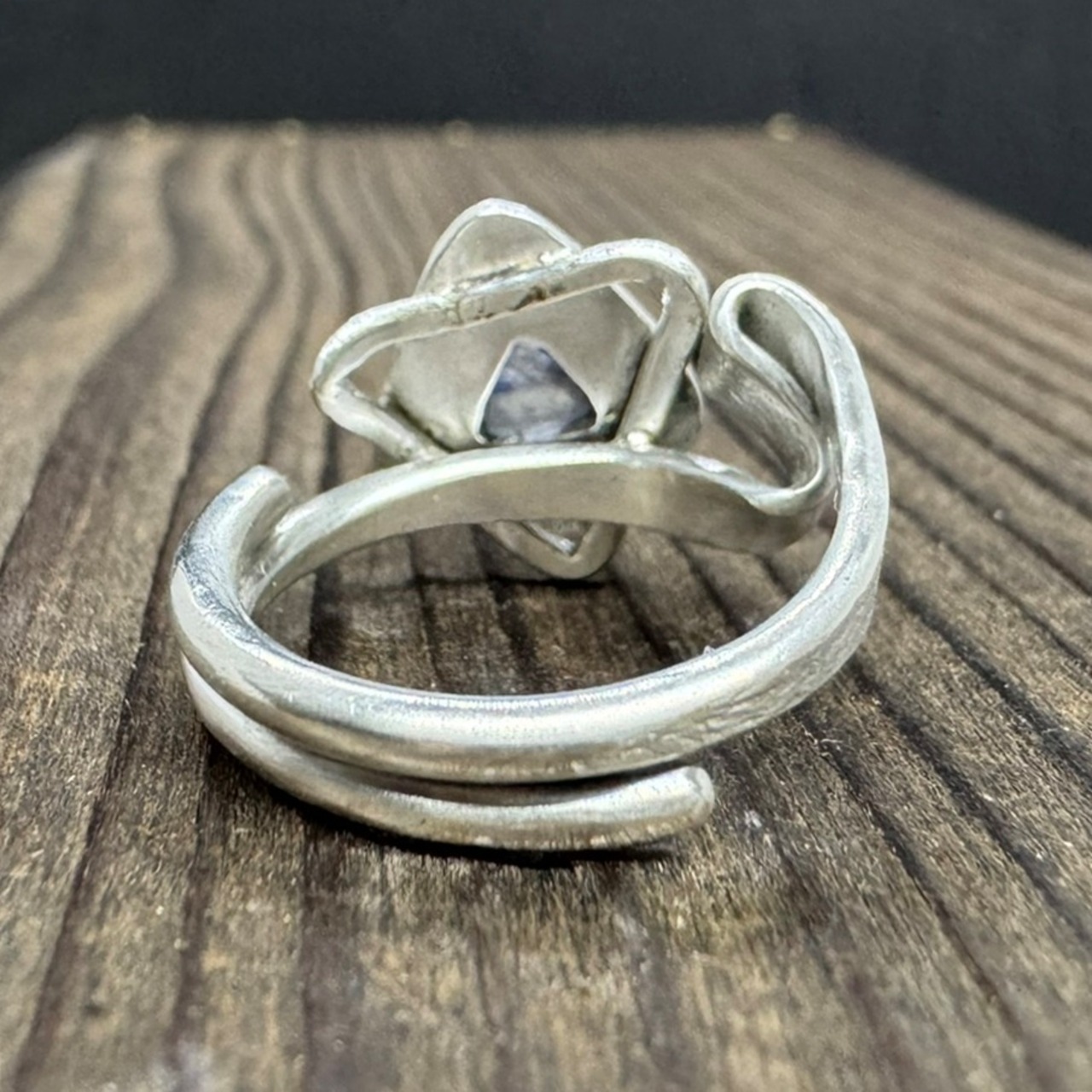 石の形が個性的でまるで青い星が入っているようだったので、魔法が使えそうな指輪にしたいと思ってデザインしました。