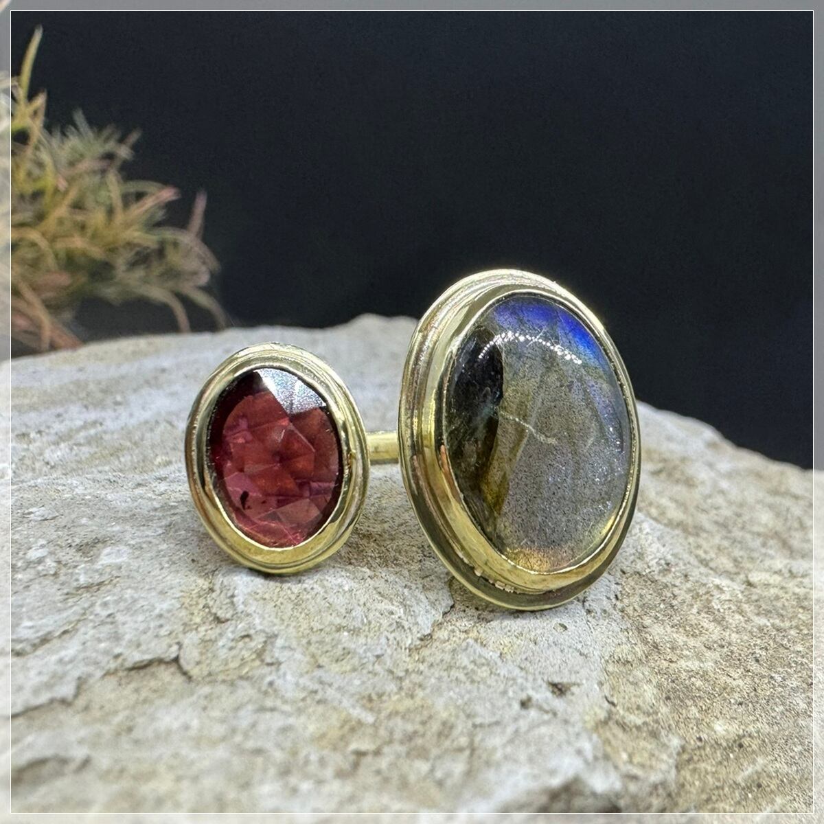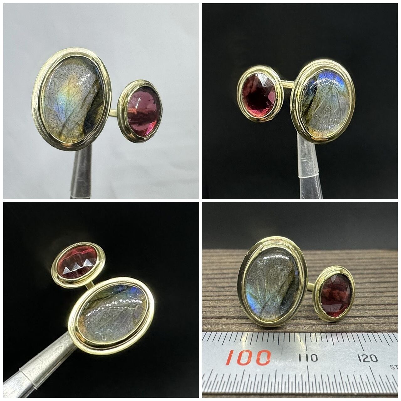 楕円形のラブラドライトとガーネットを使ったフォークリングです。