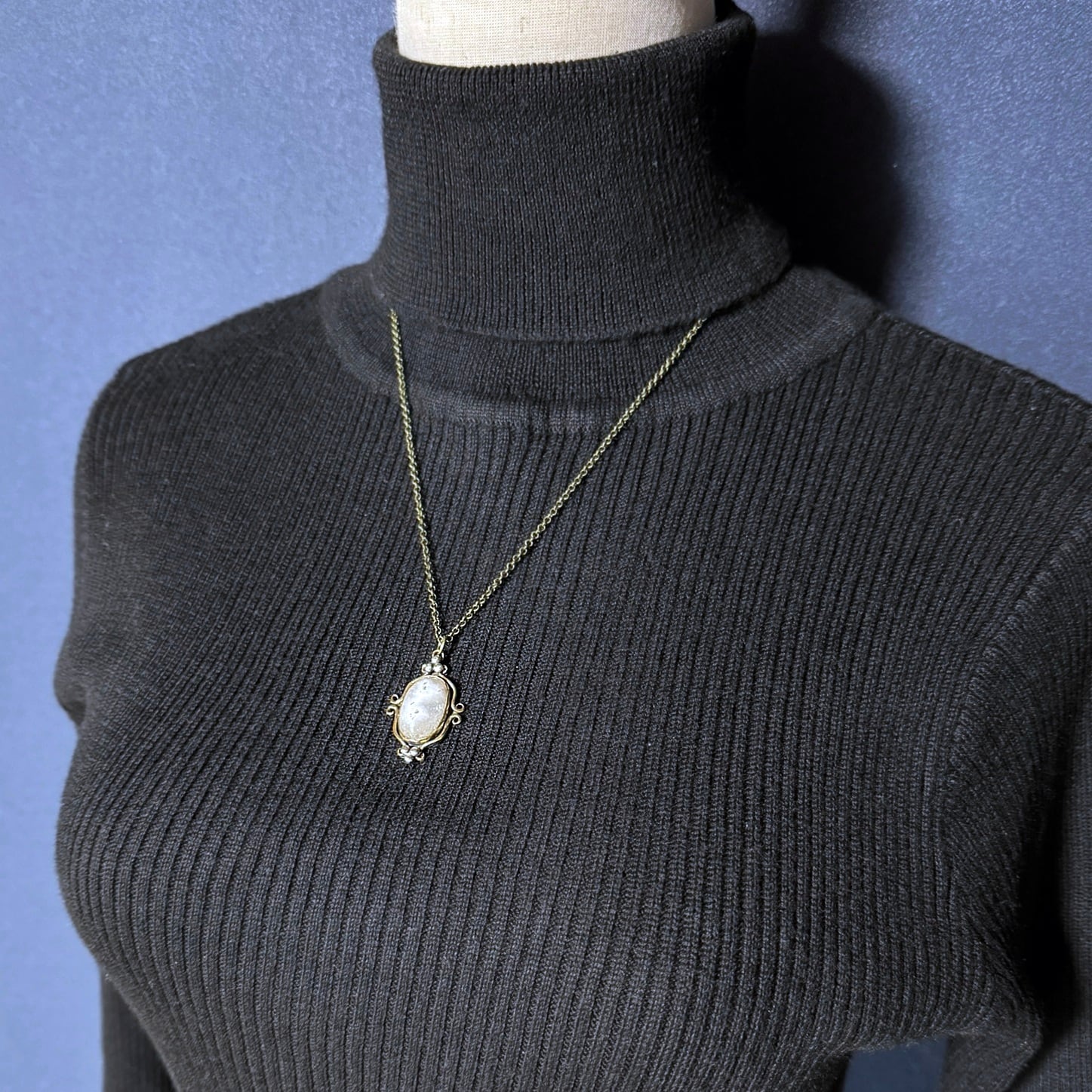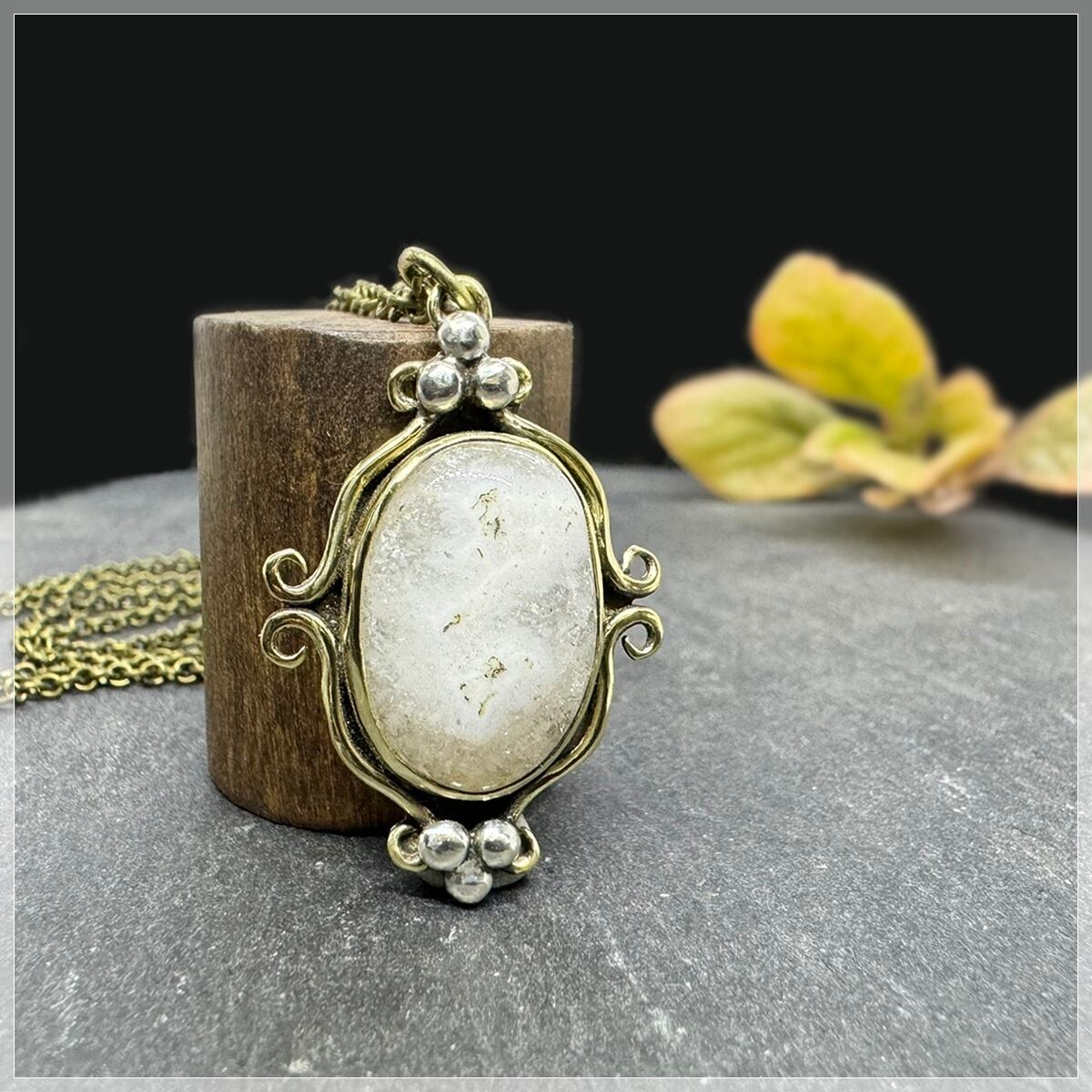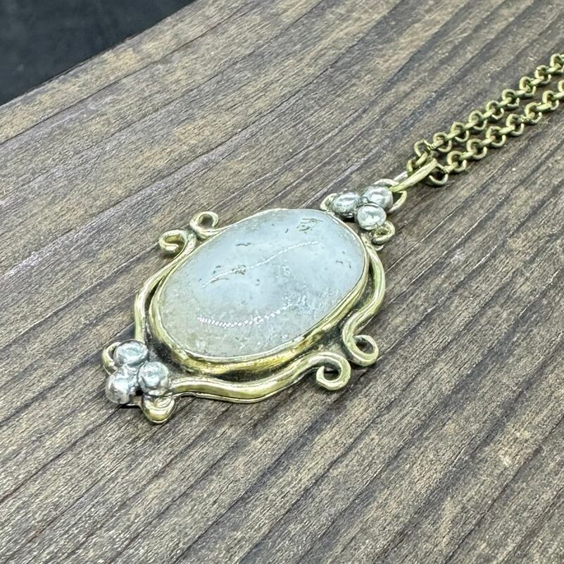 石の周りは真鍮で囲み、更に真鍮のクルンとした飾りとシルバーの粒を合わせておとぎ話に出てくる鏡のイメージでデザインしました。