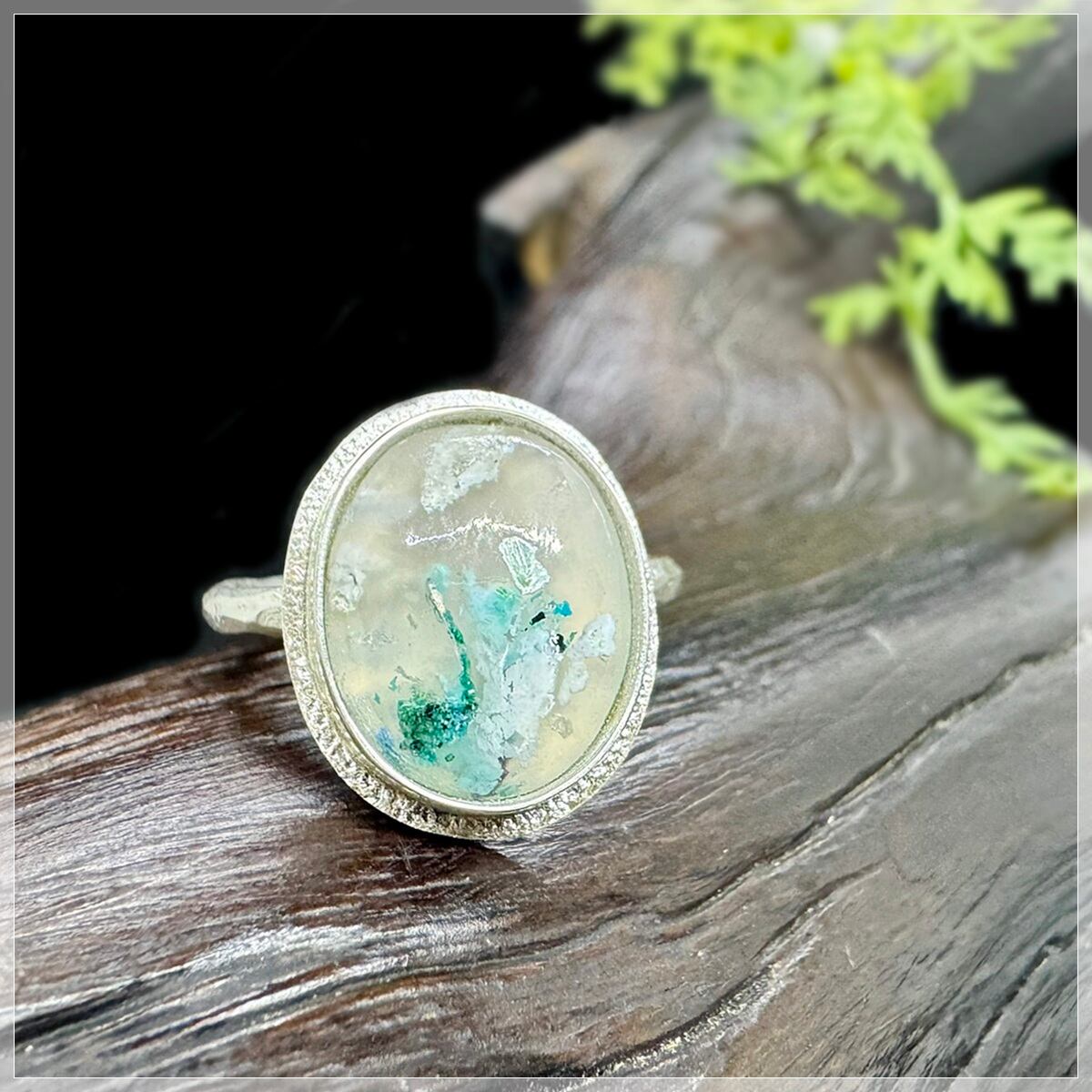 石の周りはシルバーで囲み、周りに細かな飾りを入れて額縁のような雰囲気にしました。